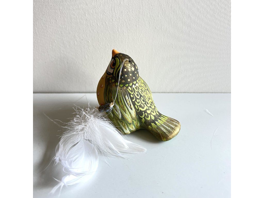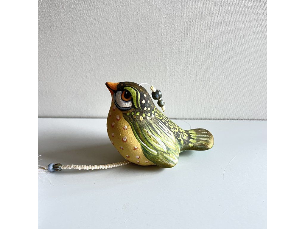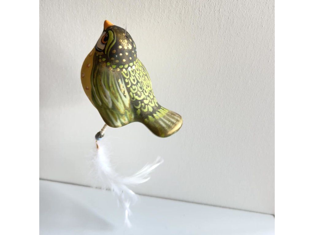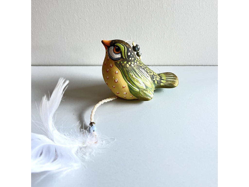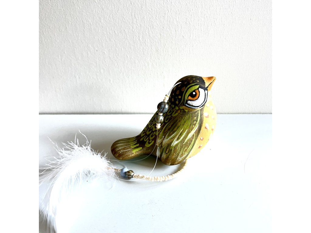 Krásný ptáček mnou ručně malovaný, zářivý krásnými barvami. Zavěšený na slabounkém ale pevném lanku a ozdobený skleněnými blýskavými korálky a peříčky.