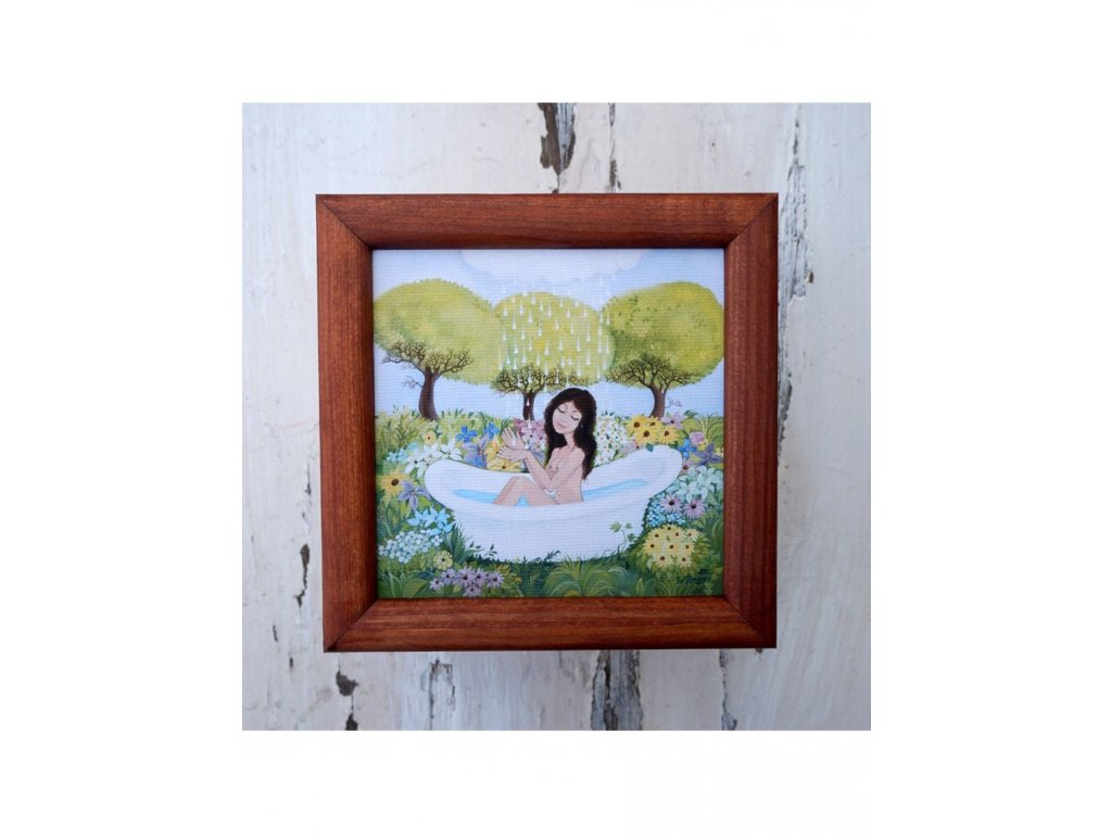 Obrázek je velký 13,5 x 13,5 cm, rámovaný v jednoduchém dřevěném rámečku.