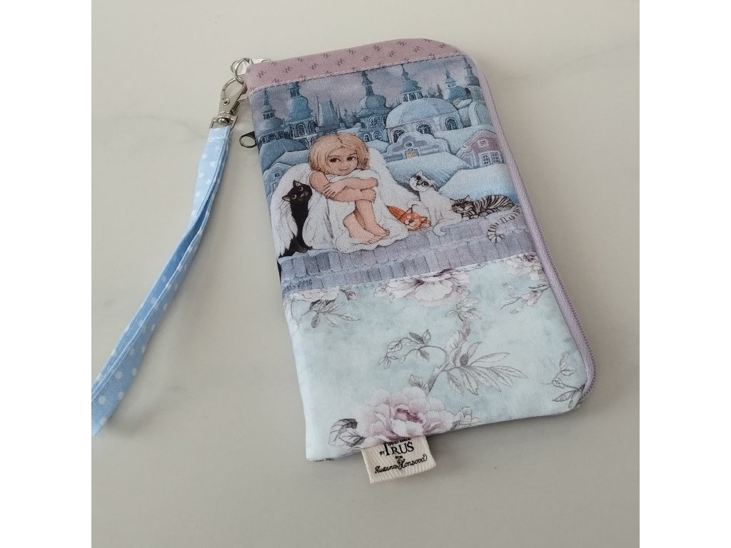 Obal na mobilní telefon s kapsičkou a poutkem na zápěstí - Andělka a kočičky