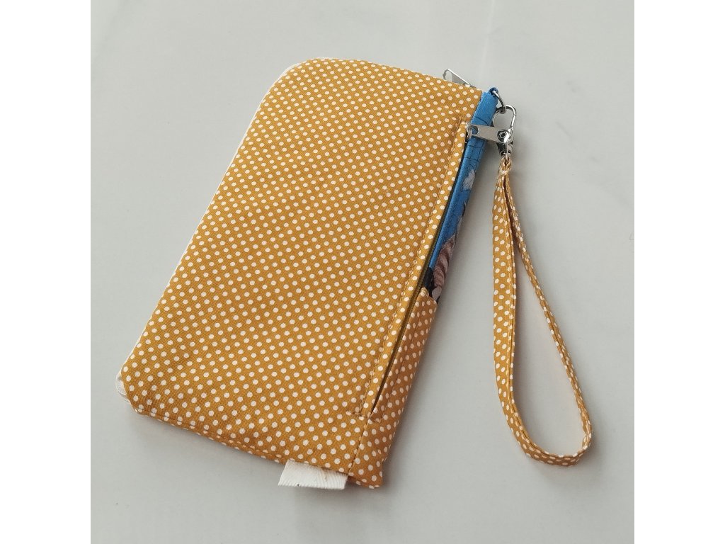 Nové pozdro na telefon. Tento střih jsem vymyslela na dovolené, když jsem s sebou na pláž nechtěla nosit celou peněženku i telefon :-). Peníze jsem si vždy dala do pouzdra k telefonu, ale stalo se mi, že jsem je při vyndavání telefonu ztratila :-(. Takže jsem přijela domů a hned šla na to. Toto pouzdro je super, když jen tak vyběhnete na procházku, na pivko, na grilovačku, k vodě.... . Má na zadní straně samostatnou zipovou kapsičku, do které v pohodě dáte klíče, kartu, drobné i složenou bankovku. Pouzdro má navíc praktické poutko pro nošení na zápěstí, které ale díky karabince, která je zapnutá do malého poutečka s kovovým polokroužkem,  můžete sundat, když dáváte pouzdro do kabelky a frčíte někam i s kabelkou. Já jsem tedy absolutně spokojená a tak doufám, že udělám radost tímto praktickým kabelkopouzdrem i některým z vás :-).