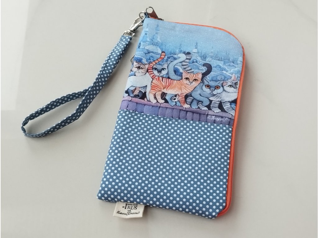 Nové pozdro na telefon. Tento střih jsem vymyslela na dovolené, když jsem s sebou na pláž nechtěla nosit celou peněženku i telefon :-). Peníze jsem si vždy dala do pouzdra k telefonu, ale stalo se mi, že jsem je při vyndavání telefonu ztratila :-(. Takže jsem přijela domů a hned šla na to. Toto pouzdro je super, když jen tak vyběhnete na procházku, na pivko, na grilovačku, k vodě.... . Má na zadní straně samostatnou zipovou kapsičku, do které v pohodě dáte klíče, kartu, drobné i složenou bankovku. Pouzdro má navíc praktické poutko pro nošení na zápěstí, které ale díky karabince, která je zapnutá do malého poutečka s kovovým polokroužkem,  můžete sundat, když dáváte pouzdro do kabelky a frčíte někam i s kabelkou. Já jsem tedy absolutně spokojená a tak doufám, že udělám radost tímto praktickým kabelkopouzdrem i některým z vás :-).