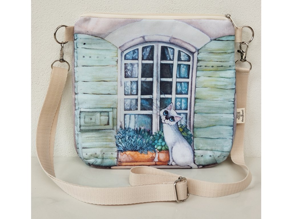 rozměry: 24 x 22 cm. Zadní strana je z americké designové látky. Uvnitř je kapsa na klíče a mobil.