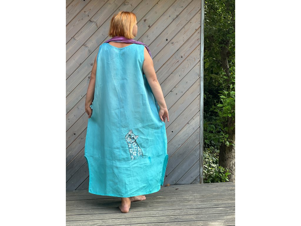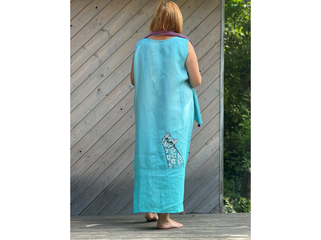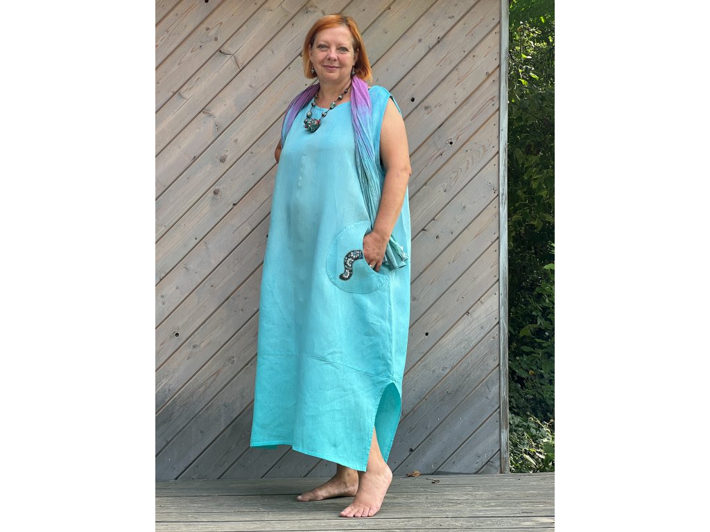 Novinka- nádherné originální lněné šaty (švadlence Radce se moc povedly), ručně barvené (několik odstínů modré a tyrkysové) a ručně malované. Jsou jen jedny jediné, stejné nepotkáte.