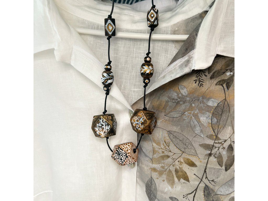 Korálky jsou malované nalakované nepravidelně navlečené na umělé kulaté kůži. Zapínaní mají na posuvné uzly takže délku můžete dost regulovat - podle náladya oblečení. Korálky jsou různě velké od 0,5 -4,5 cm.