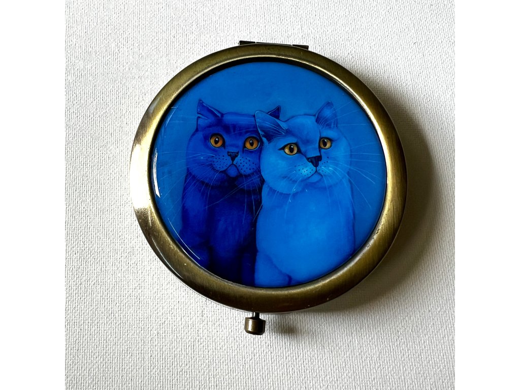 Otevírací zrcátko velké 70 mm. Uvnitř jsou dvě zrcátka, jedno je klasické a druhé zvětšovací. nahoře je můj obrázek chráněný pružnou čočkou.