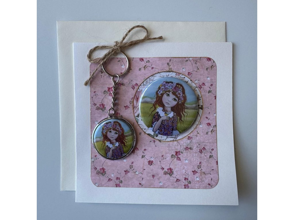 Přáníčko s magnetem a klíčenkou Holčička s ptáčkem