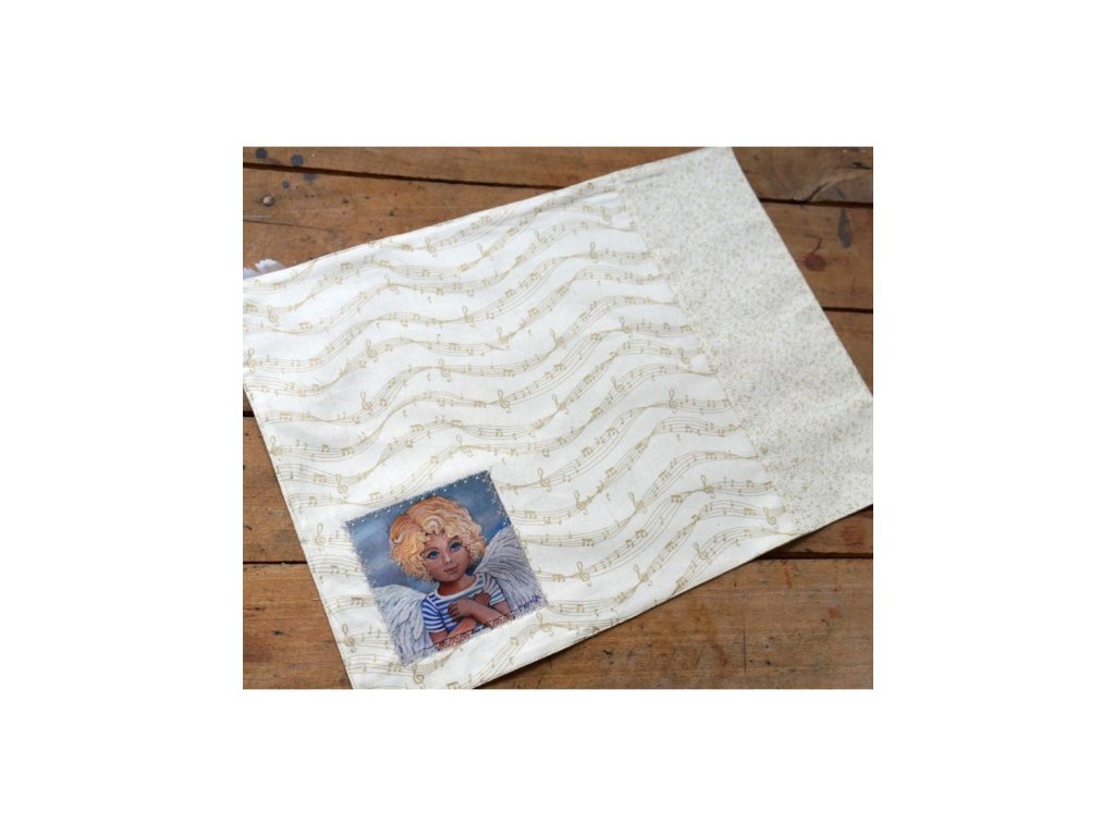 látka se zlatým potiskem, okolo obrázku vyšívané.