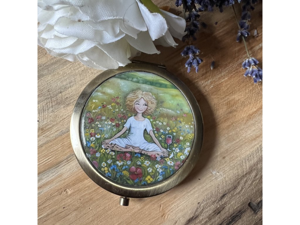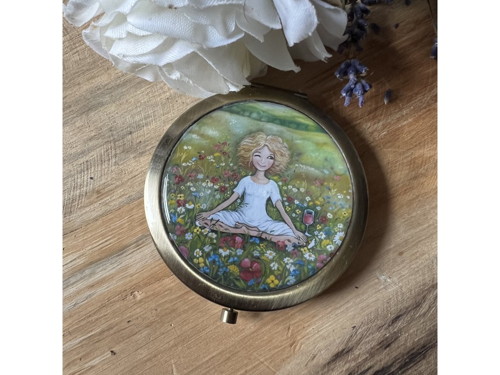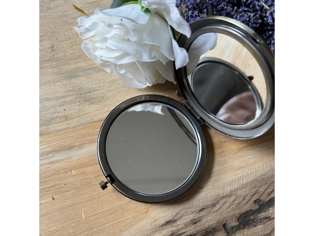 Otevírací zrcátko velké 70 mm. Uvnitř jsou dvě zrcátka, jedno je klasické a druhé zvětšovací. nahoře je můj obrázek chráněný pružnou čočkou.