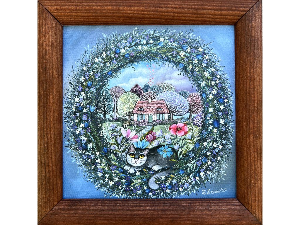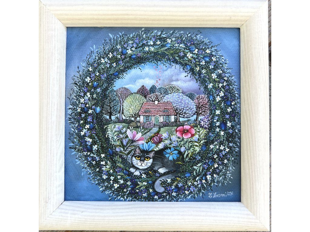 Obrázek je velký 13,5 x 13,5 cm, rámovaný v jednoduchém dřevěném rámečku.