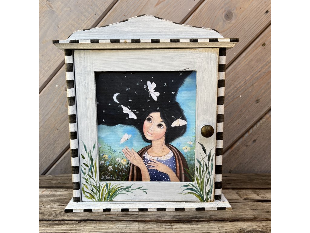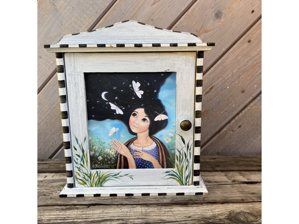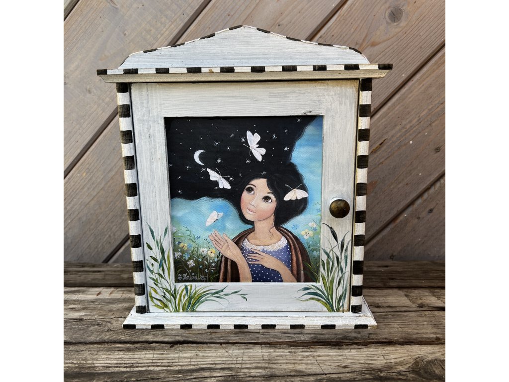 na dvířkách můj obrázek vytištěný na plátně a domalovávaný.