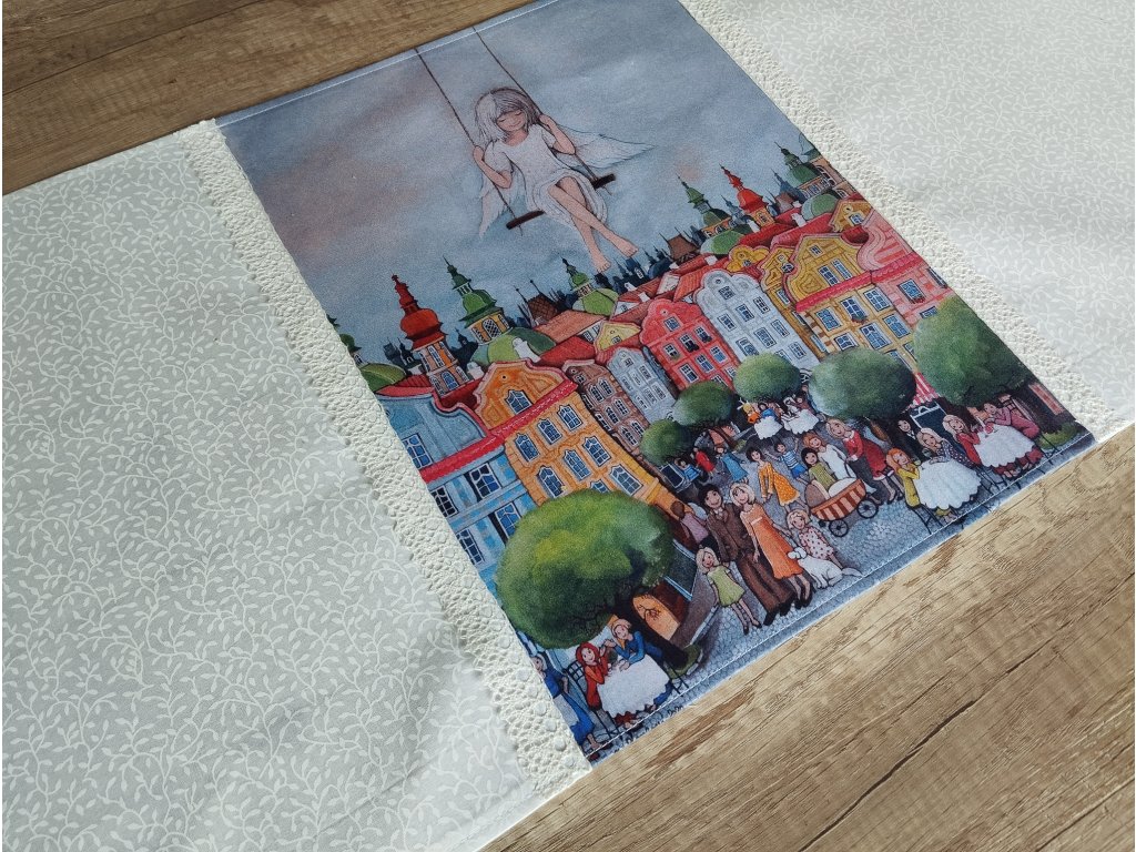 velikost je 37 x 92 cm. Materiál je bavlna - americká látka se stříbrným potiskem a můj obrázek vytištěný na saténu..
