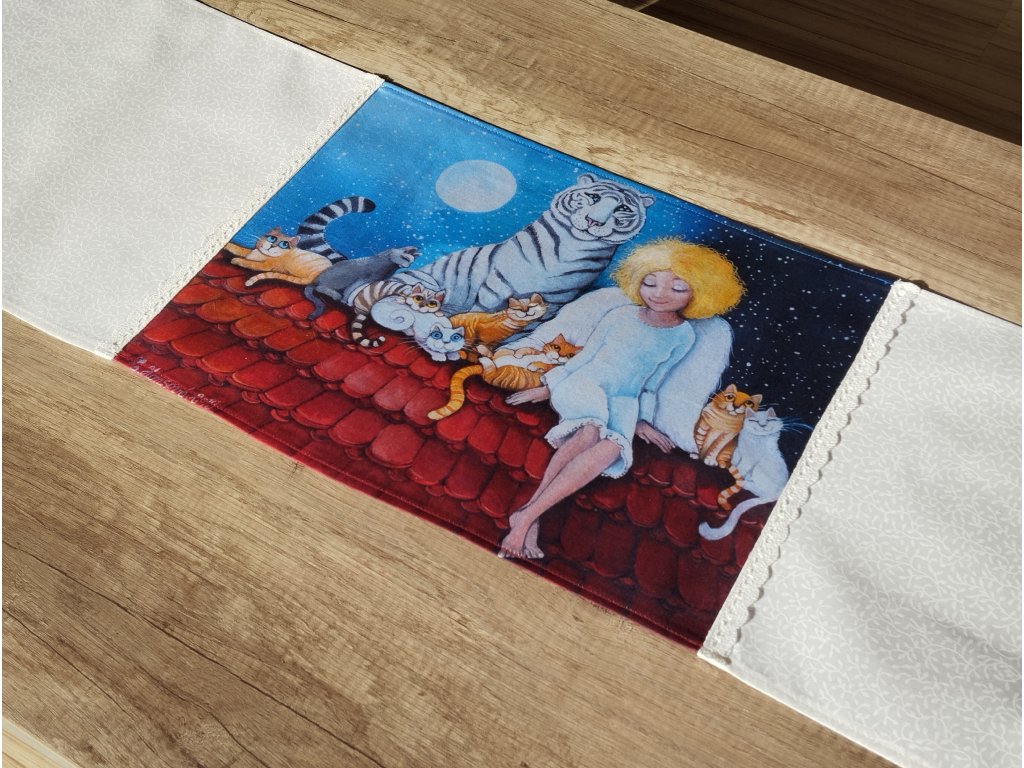 velikost je 37 x 92 cm. Materiál je bavlna - americká látka se stříbrným potiskem a můj obrázek vytištěný na saténu..