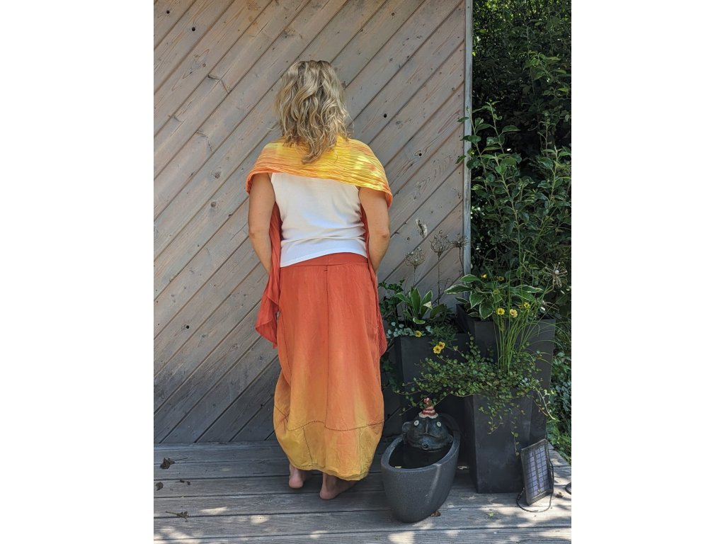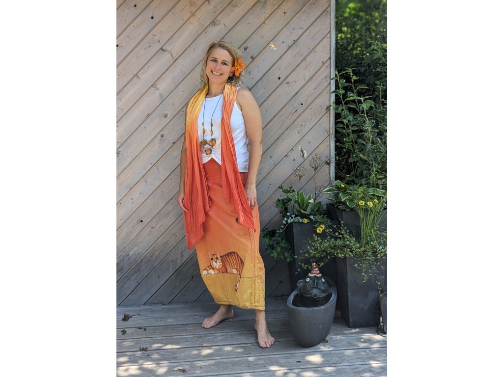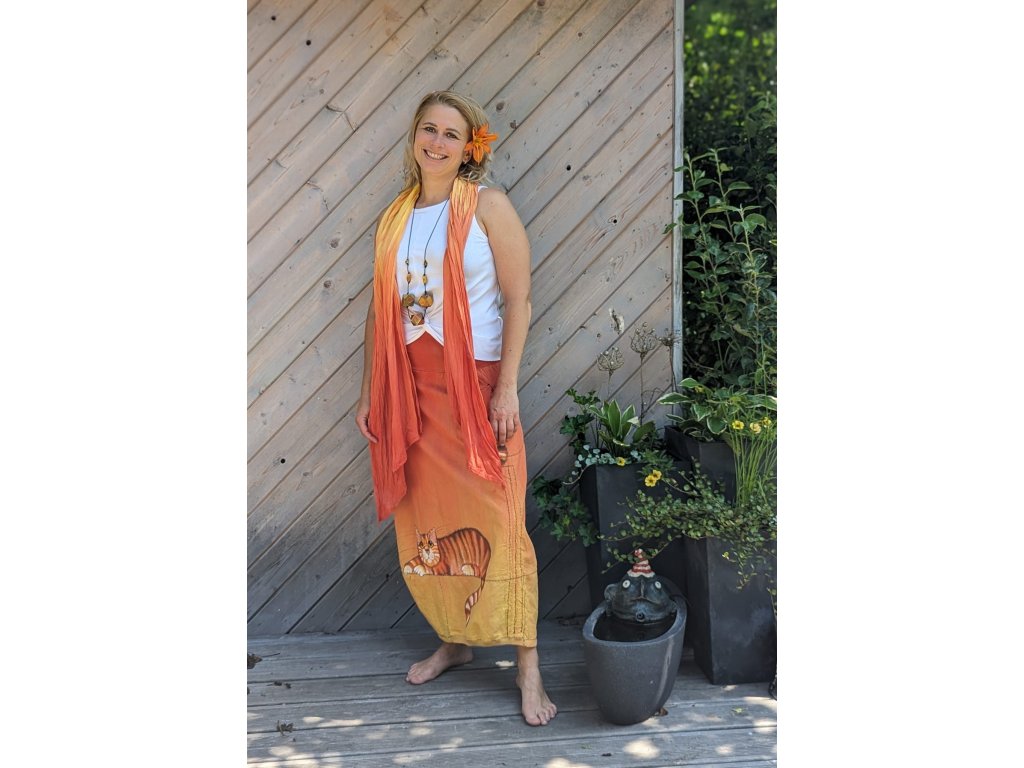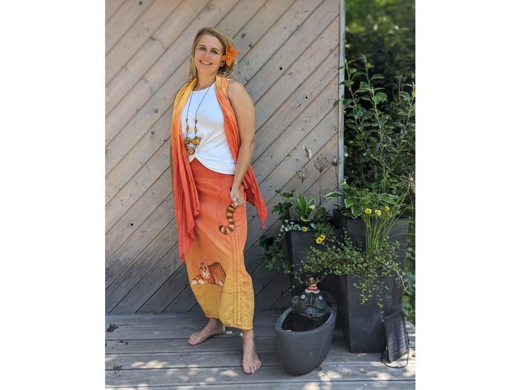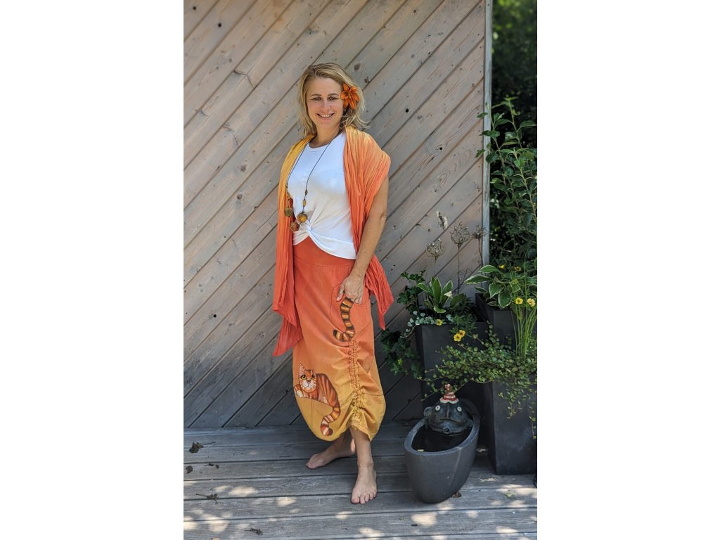 Já sukni obarvila a omalovala - kvalitními barvami na textil. Sukně je jedna jediná. Barvy jsou kvalitní říká se jim reaktivní neb vlákno neobalují ,ale vnikají dovnitř vlákna, ještě Vám asi pustínějaká barva, ale to je jen nedokonalým vymácháním - ač se snažím doopravdy hodně prostě to nedokáži :-))(mám jen omezenou vodu a vypouštím většinou celou studnu..