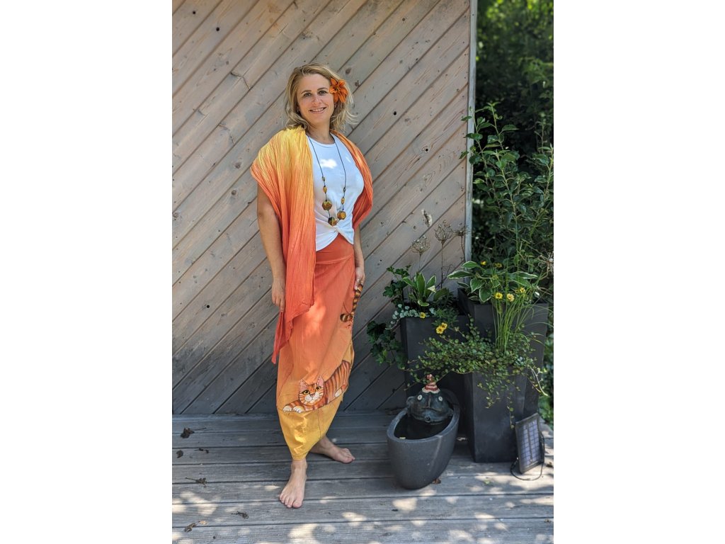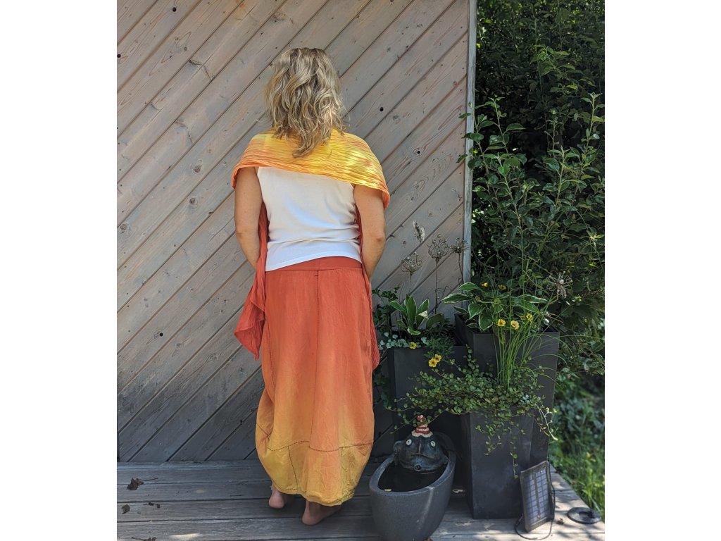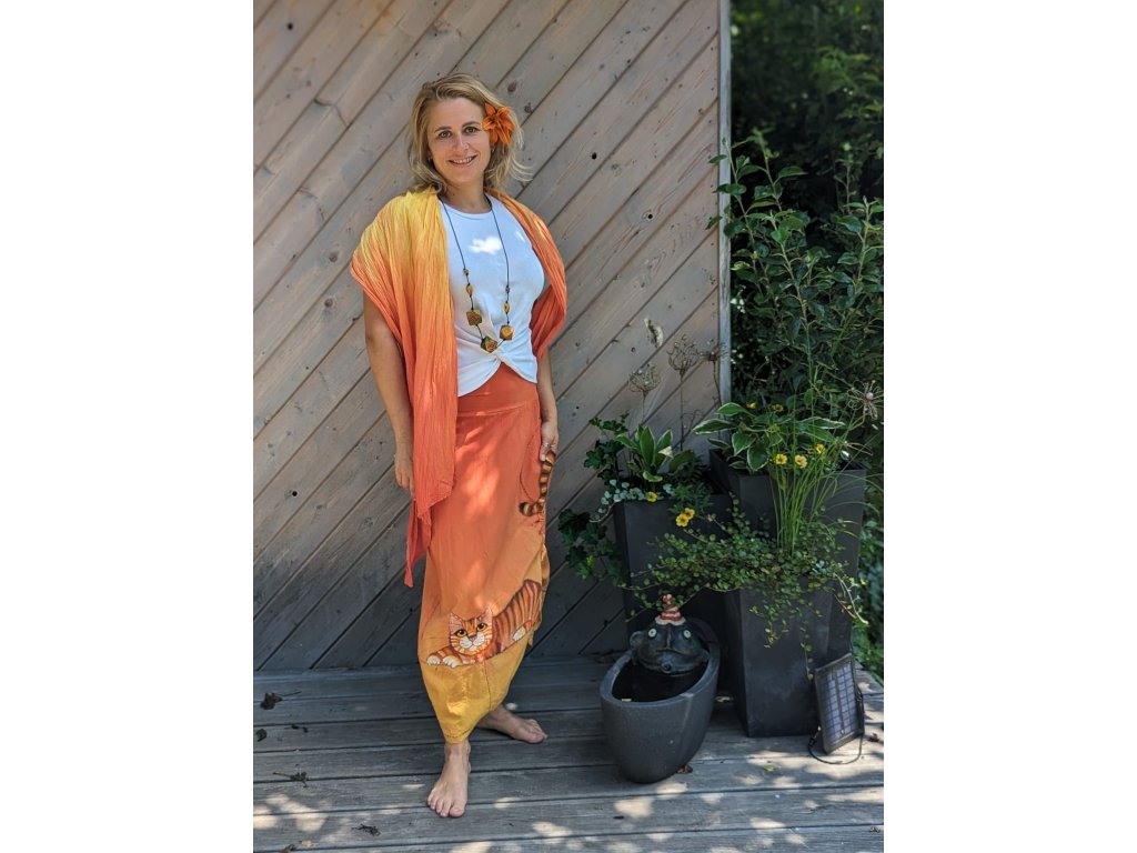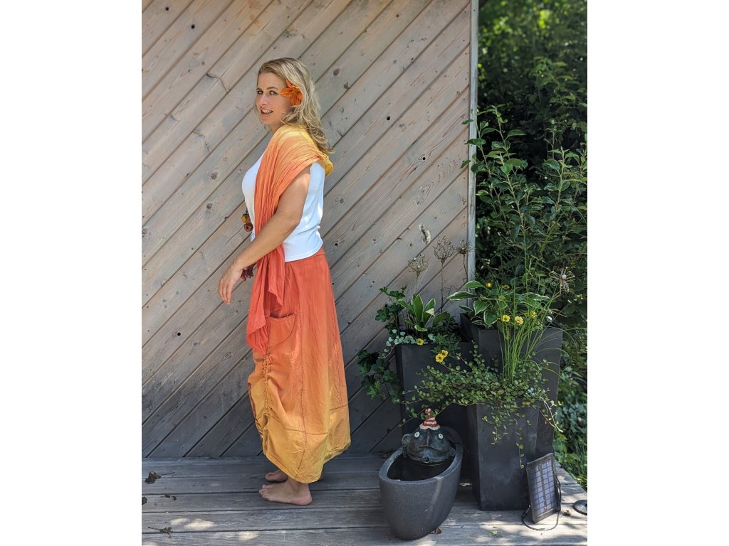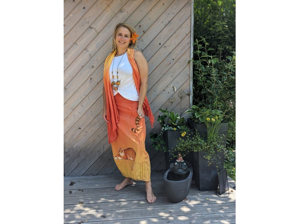 Já sukni obarvila a omalovala - kvalitními barvami na textil. Sukně je jedna jediná. Barvy jsou kvalitní říká se jim reaktivní neb vlákno neobalují ,ale vnikají dovnitř vlákna, ještě Vám asi pustínějaká barva, ale to je jen nedokonalým vymácháním - ač se snažím doopravdy hodně prostě to nedokáži :-))(mám jen omezenou vodu a vypouštím většinou celou studnu..