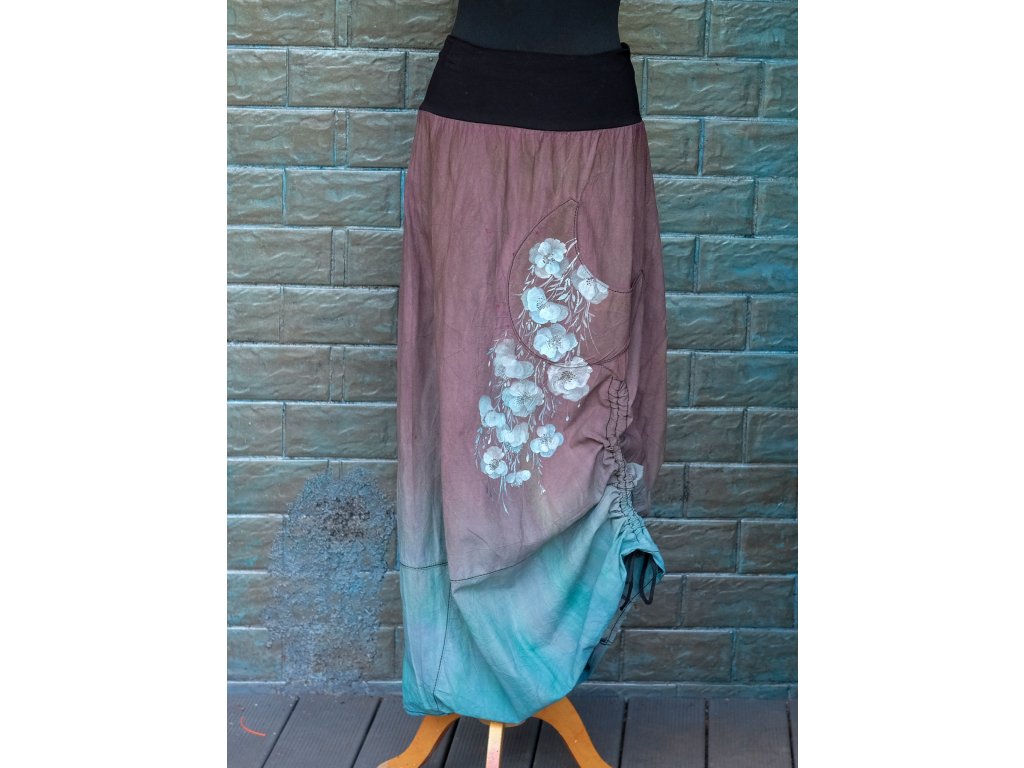 Já sukni obarvila a omalovala - kvalitními barvami na textil. Sukně je jedna jediná .Barvy jsou kvalitní říká se jim reaktivní neb vlákno neobalují ,ale vnikají dovnitř vlákna, ješět Vám "pustínějaká barva ,ale to je jen nedokonalým vynmácháním - ač se snažím doopravdy hodně prostě to nedokáži :-))