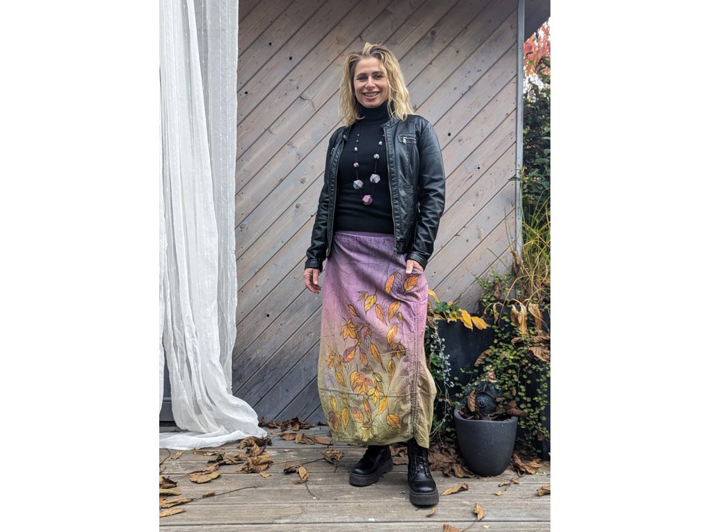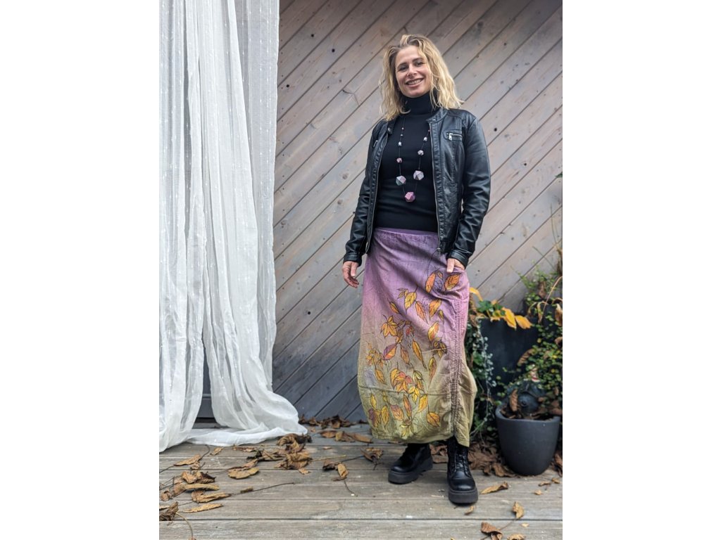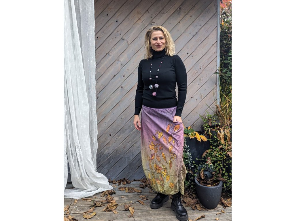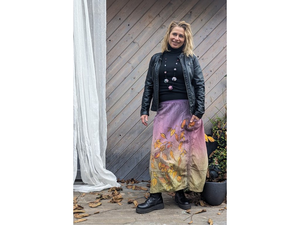 Já sukni obarvila a omalovala - kvalitními barvami na textil. Sukně je jedna jediná. Barvy jsou kvalitní říká se jim reaktivní neb vlákno neobalují ,ale vnikají dovnitř vlákna, ještě Vám asi pustí nějaká barva, ale to je jen nedokonalým vymácháním - ač se snažím doopravdy hodně prostě to nedokáži :-))(mám jen omezenou vodu a vypouštím většinou celou studnu..