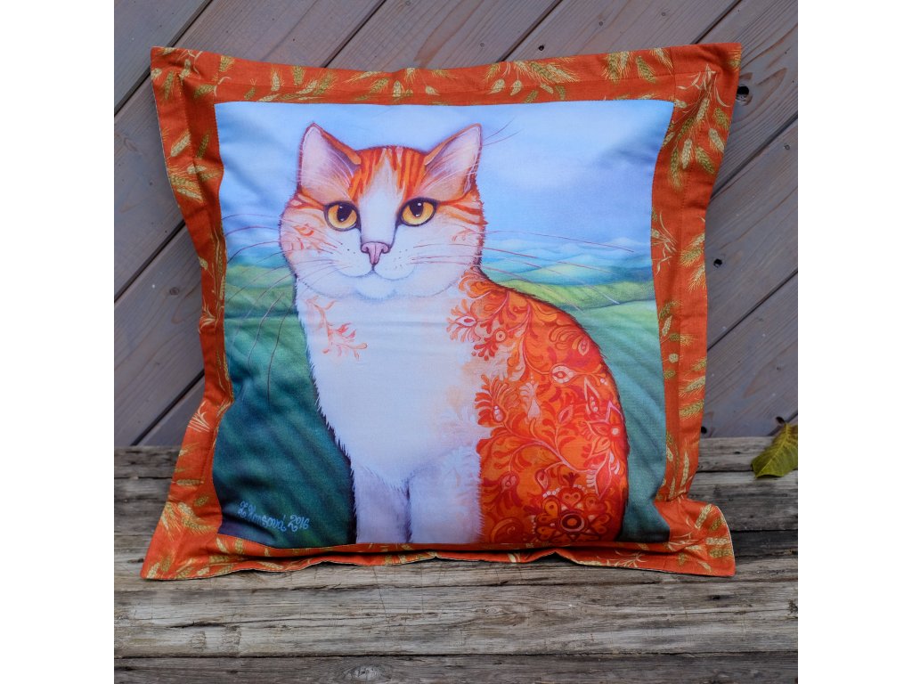 Polštář je ušitá z mé látky kterou jsem si nechala vytisknout. Velikost obrázku je 40 x40 cm okolo je ozdobný okraj z amerických designových látek. Přední strana je podložená termolínem. Potah na zip.