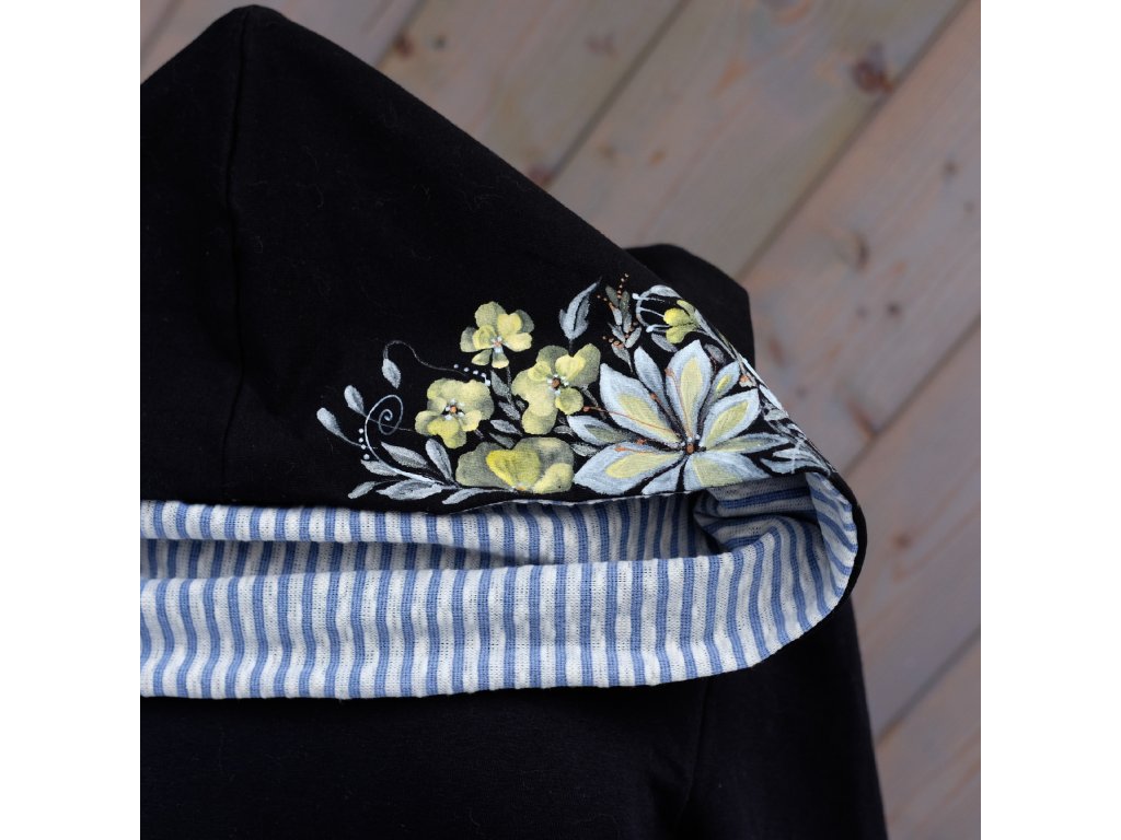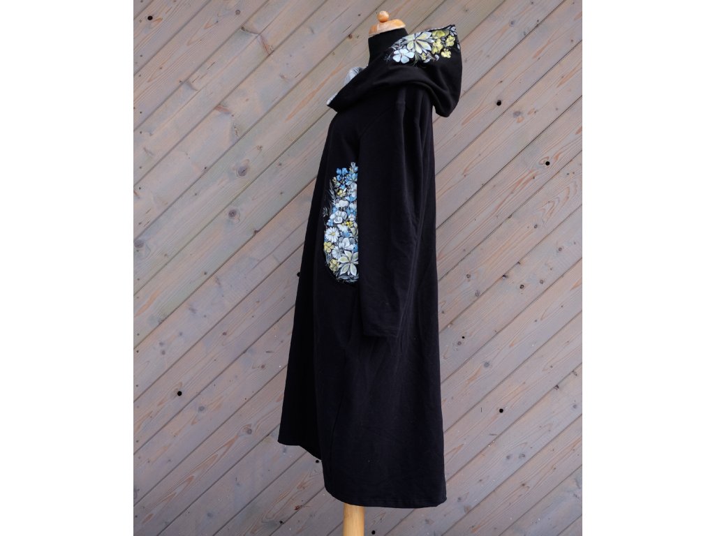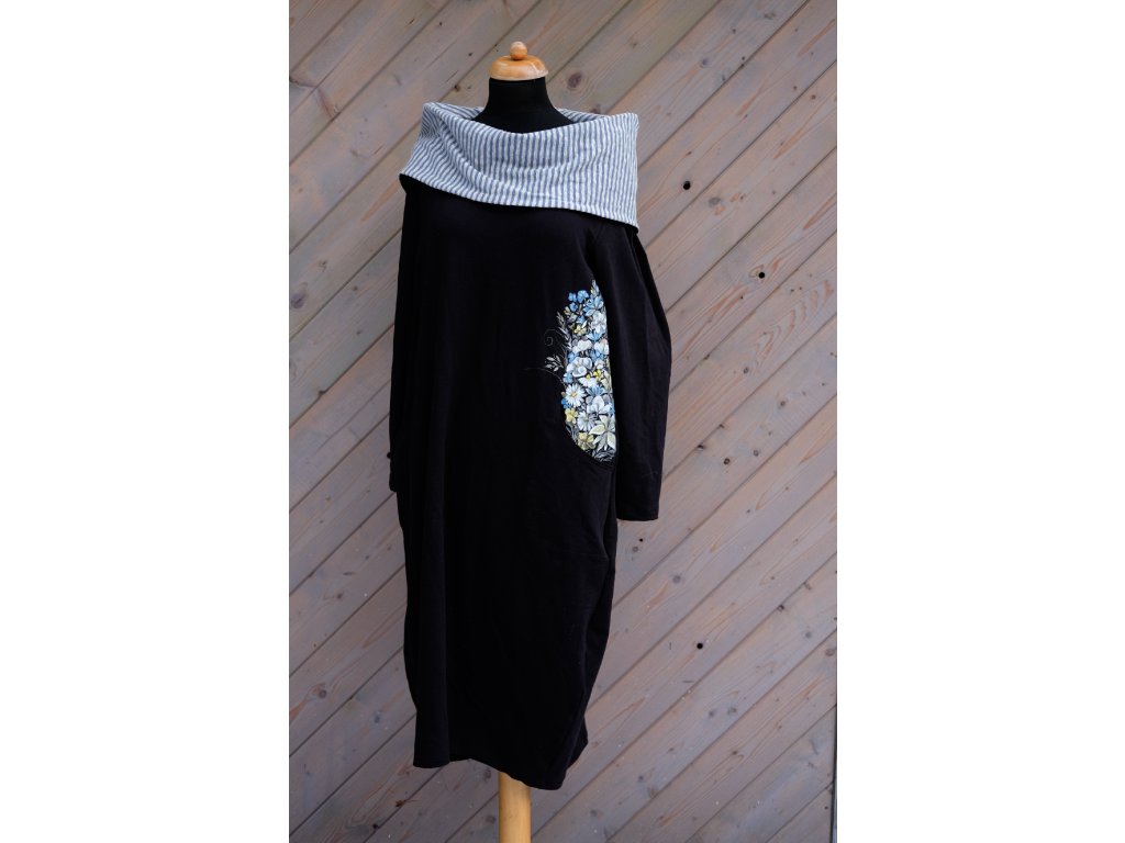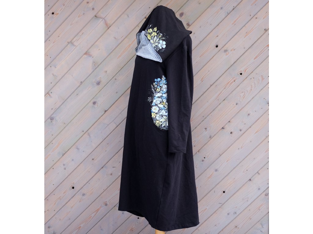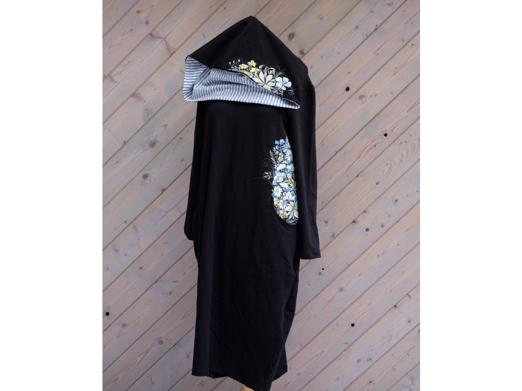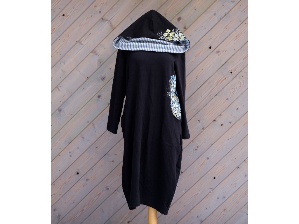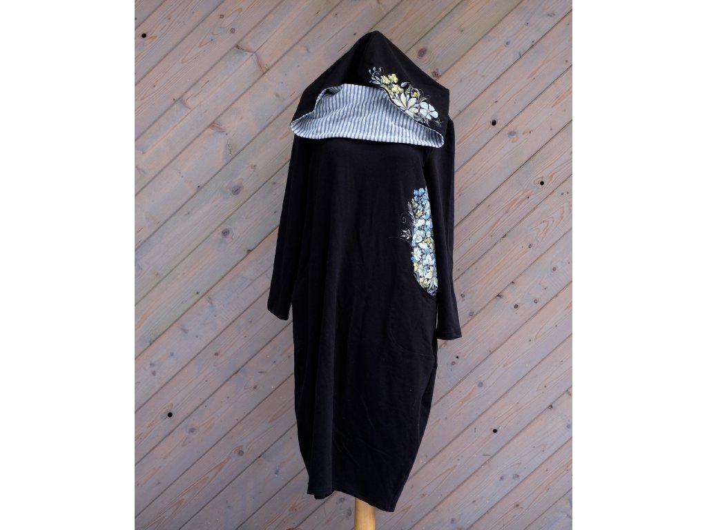 Střih princes přecházející do kapes. Šaty splývají nejsou na tělo, jsou pohodlné a lichotí každé postavě.Mají prodloužený zadní díl, přední díl je do mírného obloučku. Rukáv hlavicový. Kapsy vsazené do princesu. Kapuce lze nosit i jako velký límec - šaty jsou vriabilní neokoukají se. Vnitřek kapuce (límce) je krásný jemný proužek úplet)
