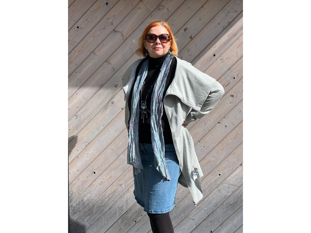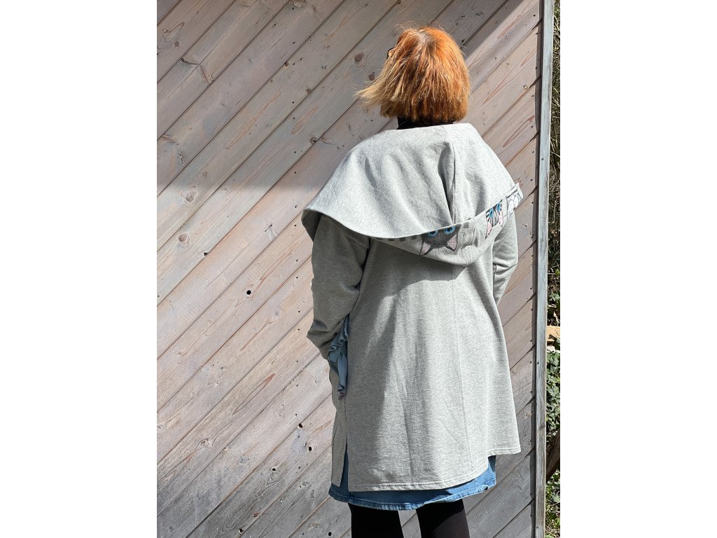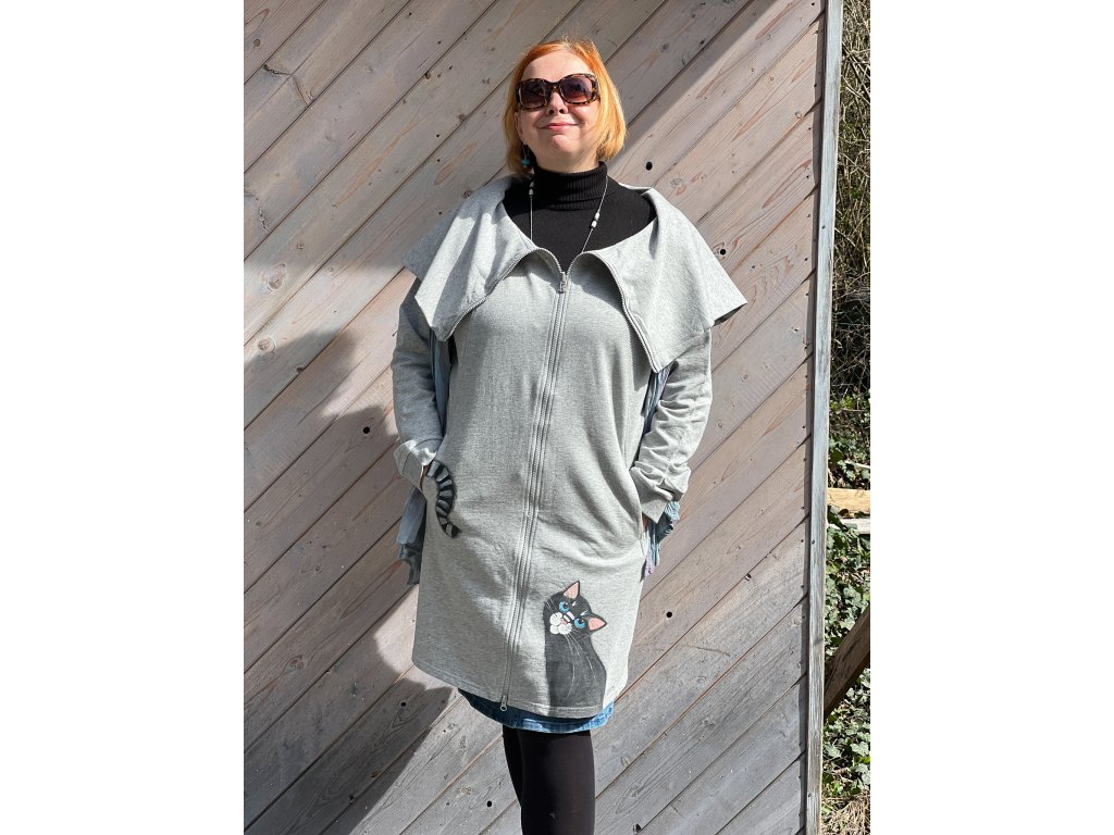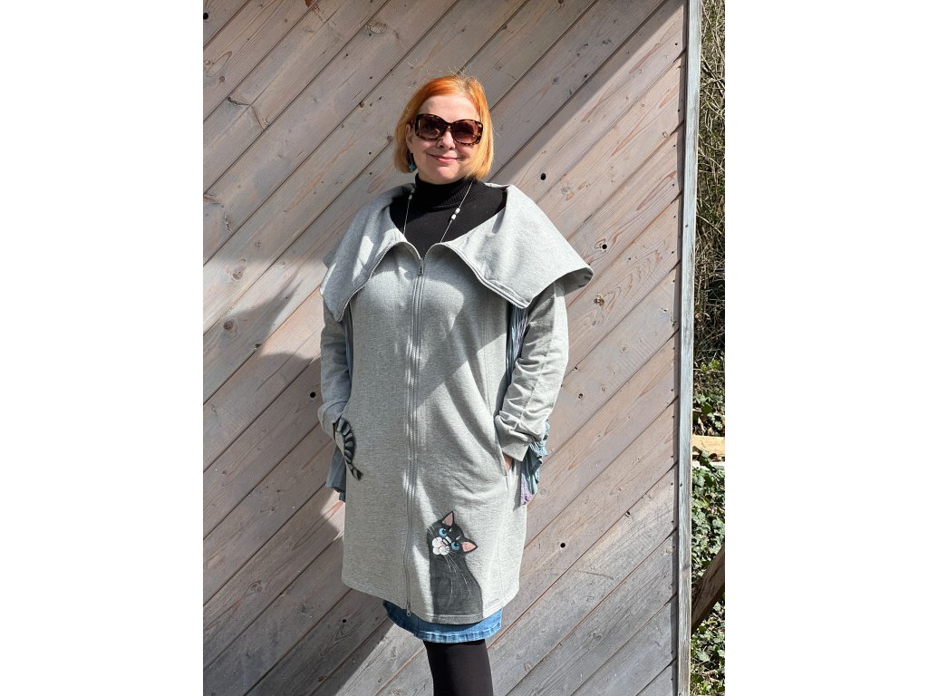 Moc hezká, kvalitní a zajímavá mikina s velkou kapucí, kterou lze nosit přes ramena. Vysoko rozepínací dvoucestný zip. Kapsy ve švu. Postranní rozparky.