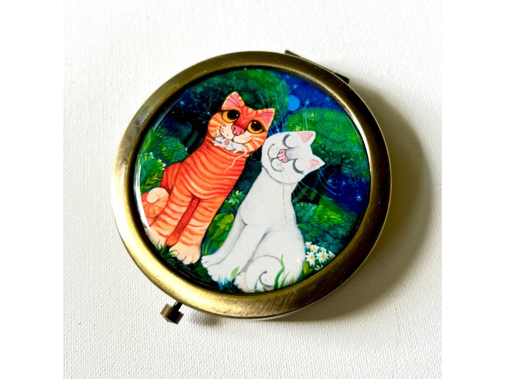 Otevírací zrcátko velké 70 mm. Uvnitř jsou dvě zrcátka, jedno je klasické a druhé zvětšovací. nahoře je můj obrázek chráněný pružnou čočkou.