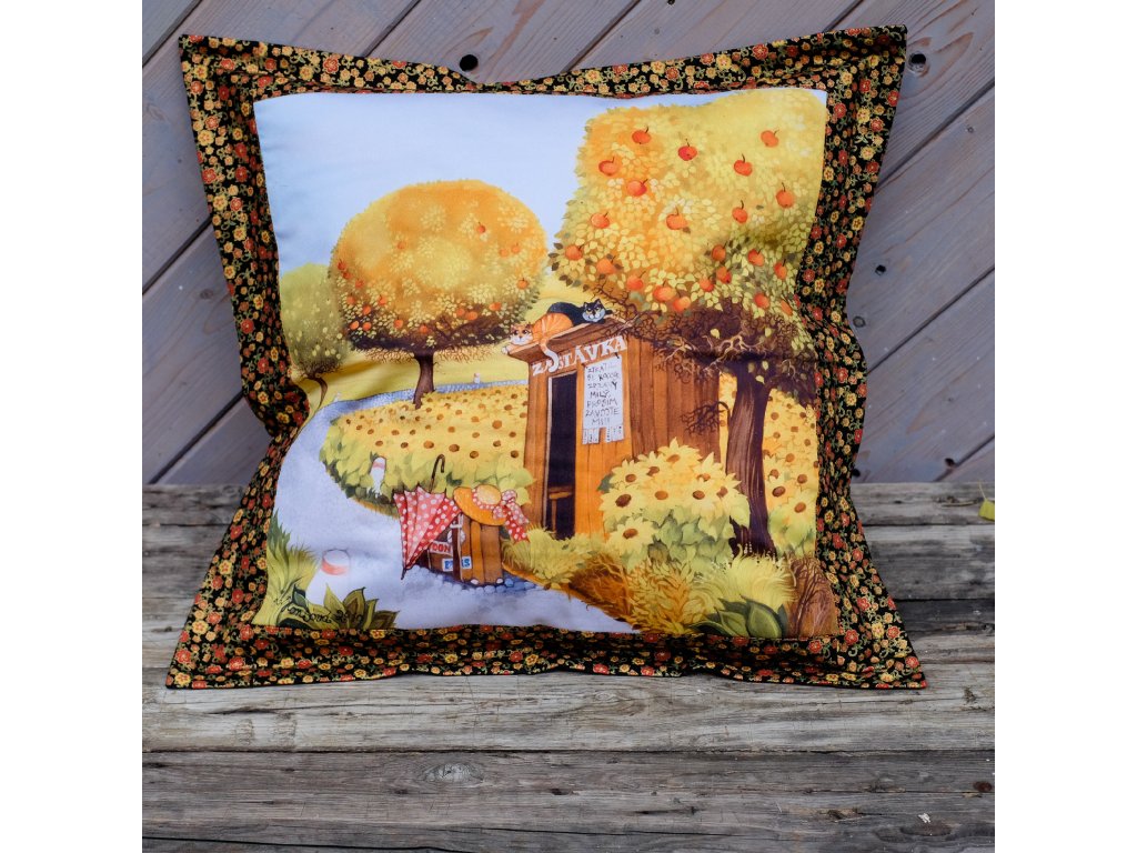 Polštář je ušitá z mé látky kterou jsem si nechala vytisknout. Velikost obrázku je 40 x40 cm okolo je ozdobný okraj z amerických designových látek. Přední strana je podložená termolínem. Potah na zip.