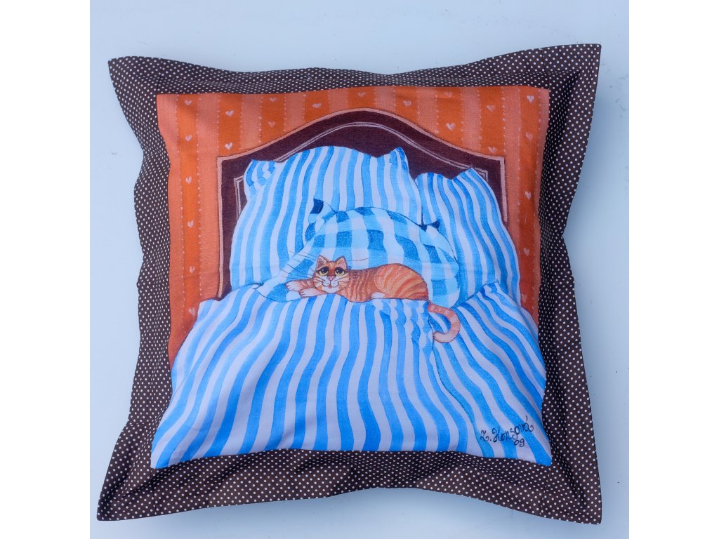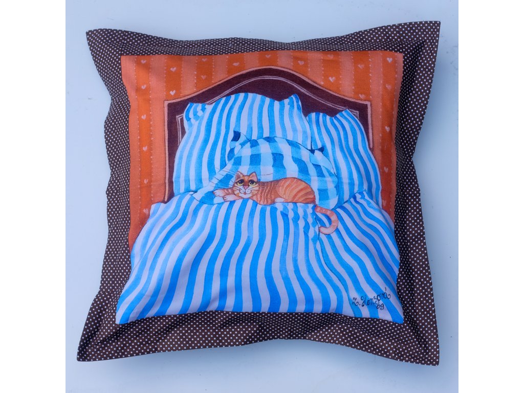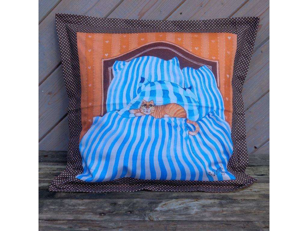 Polštář je ušitá z mé látky kterou jsem si nechala vytisknout. Velikost obrázku je 40 x40 cm okolo je ozdobný okraj z amerických designových látek. Přední strana je podložená termolínem. Potah na zip.